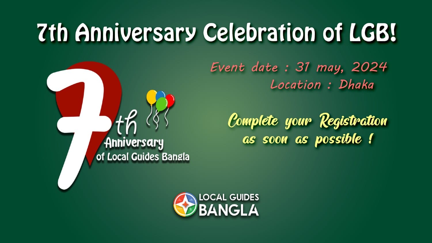 লোকাল গাইডস বাংলার ৭ম বর্ষপূর্তি উপলক্ষে সকল লোকাল গাইডসদের জানাই আন্তরিক শুভেচ্ছা এবং ধন্যবাদ। শুরু থেকে এই পর্যন্ত যারা সাপোর্ট দিয়ে আসছেন এবং এখনো সেই সাপোর্ট অব্যাহত রেখেছেন সকলের প্রতি লোকাল গাইডস বাংলা সবসময় কৃতজ্ঞ। লোকাল গাইডস বাংলার ৭ম বর্ষপূর্তির এই আনন্দকে আরো বহুগুণ বাড়াতে, সবাইকে এই আনন্দে সংযুক্ত করতে লোকাল গাইডস বাংলা আয়োজন করতে যাচ্ছে একটি বিশাল ইভেন্টের। সেই ইভেন্টে লোকাল গাইডস বাংলা টিম, উপদেষ্টাগন, শুভাকাঙ্ক্ষীগন সহ সারা বাংলাদেশের অনেক অভিজ্ঞ লোকাল গাইডসগন অংশগ্রহণ করবে। আশাকরি এই ইভেন্টটি লোকাল গাইডস কমিউনিটিতে একটি মাইলফলক হয়ে থাকবে সবসময়।